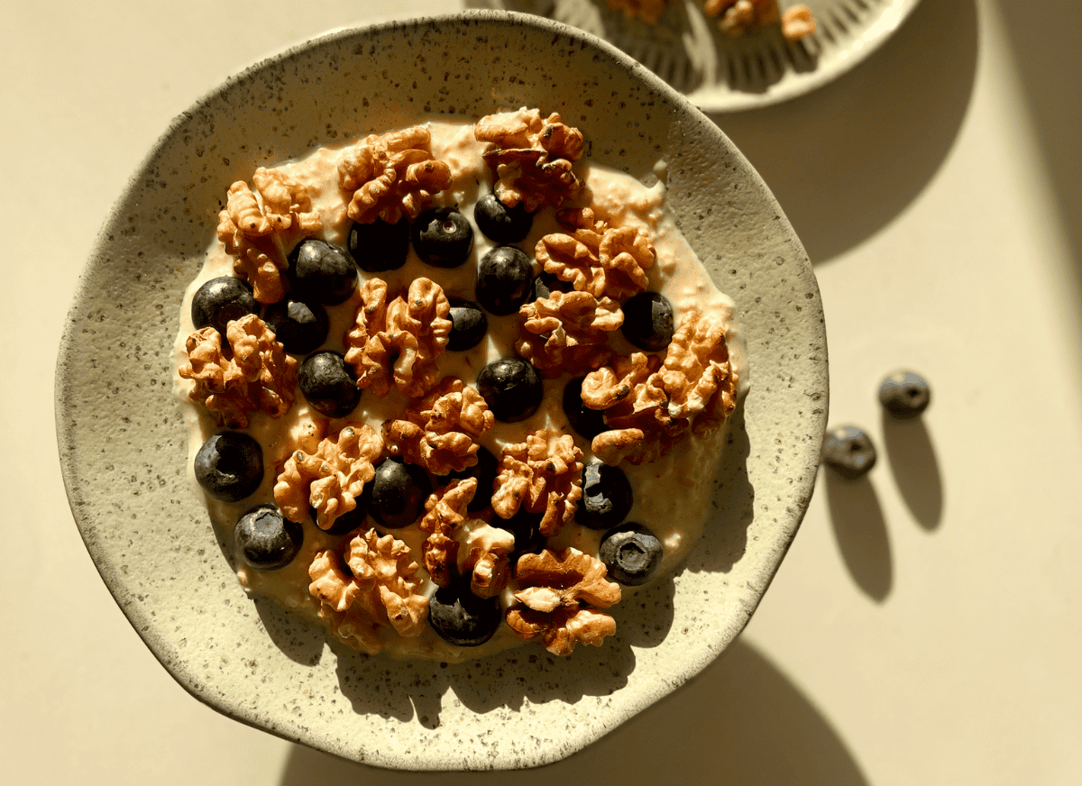 • Serve in a pretty bowl or cup and top with the rest of the blueberries and toasted walnuts.